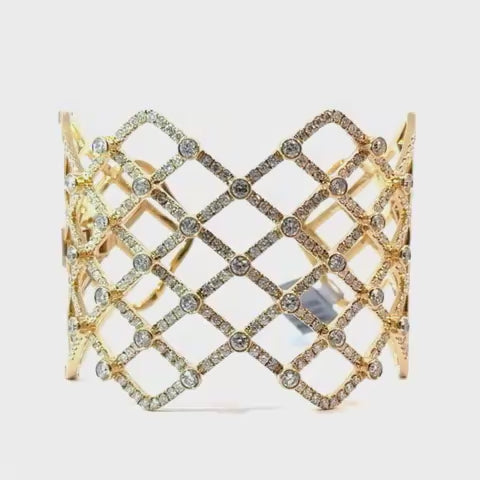 14K two tone yellow and white gold (42 grams) custom made wide band prong and bezel set 263 natural round white diamonds (6.56tcw) with a high polish comfort fit style fashion bangle. This unique and beautiful bangle is made for comfort with a smooth interior and breathable pattern, and can be worn with any yellow gold or diamond jewelry.