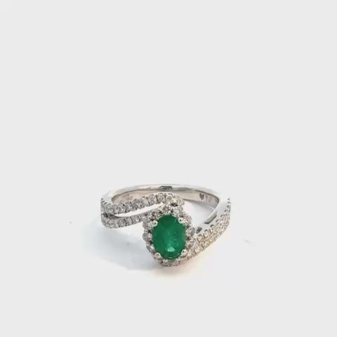 18K White Gold (4.95g) Oval-Shaped Deep Green Emerald In A Modern Design. This Ring Features A Natural 7x5mm Oval Cut Green emerald With A Double Row Of Diamonds In A Split Shank And Accent White Diamond Halo (0.82tcw).