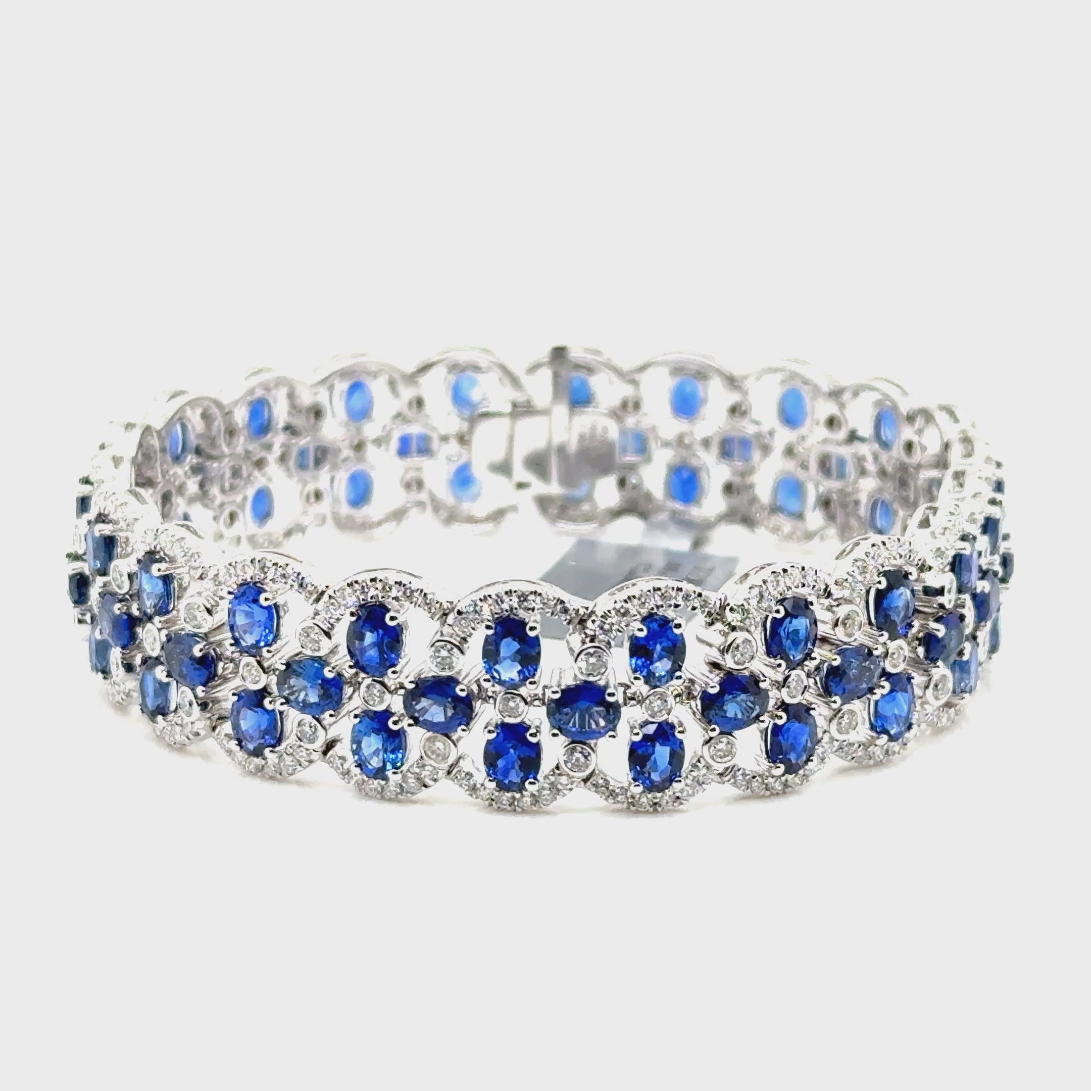 18K White Gold (38grams) Custom Ornate Pattern With 66 Natural Oval Blue Sapphires (19.80tcw) & 330 Round White Diamonds (3.35tcw) Hand Set Into Cluster Links In an Elegant Style With An Integrated Safety Mechanism Royal Fashion Bracelet.