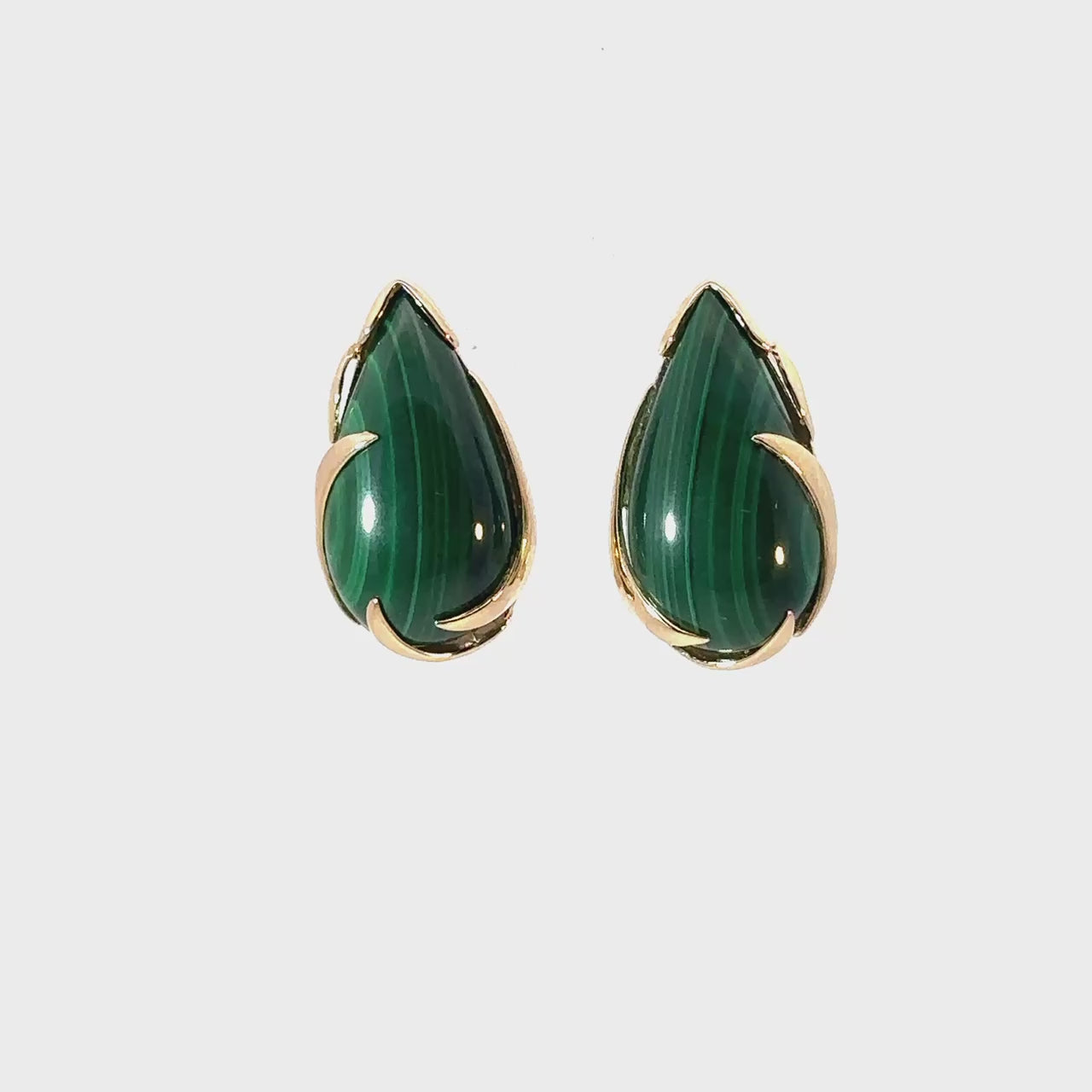 14K Yellow Gold Pear Shaped Malachite (Approx. 22.90ctw) Earrings Featured with Omega Clip Backs, 7.5 grams ESER2110