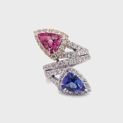 14k T/T White & Yellow Gold (11.9grams) Tourmaline, Tanzanite and Diamond Accent Ring in a bypass design with a bright polish finish. One prong set violet blue triangle modified brilliant cut natural tanzanite 10.00 x 7.37mm (2.00ct). One Prong set purplish red triangle modified brilliant cut natural pink tourmaline, 9.95 x 8.00mm (2.20ct). Seventy-three round brilliant cut diamonds 1.50-2.20mm (3.10ct). Four bead set round modified cut natural red rubies 2.00mm (0.16ct). This is a stunning one of a kind custom design that is hand made with exquisite natural gemstones.