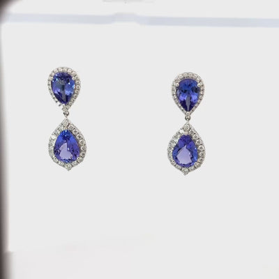 18k White Gold (7.09g) Natural and Elegant Pear Shaped Purple/Blue Tanzanite and Diamond Dangle Halo Earrings. Four Beautiful Pear Shaped Tanzanite (8.40tcw) With 82 Round Diamonds (1.19tcw) In A Stunning Dangle Style Pair of Fashion Earrings.