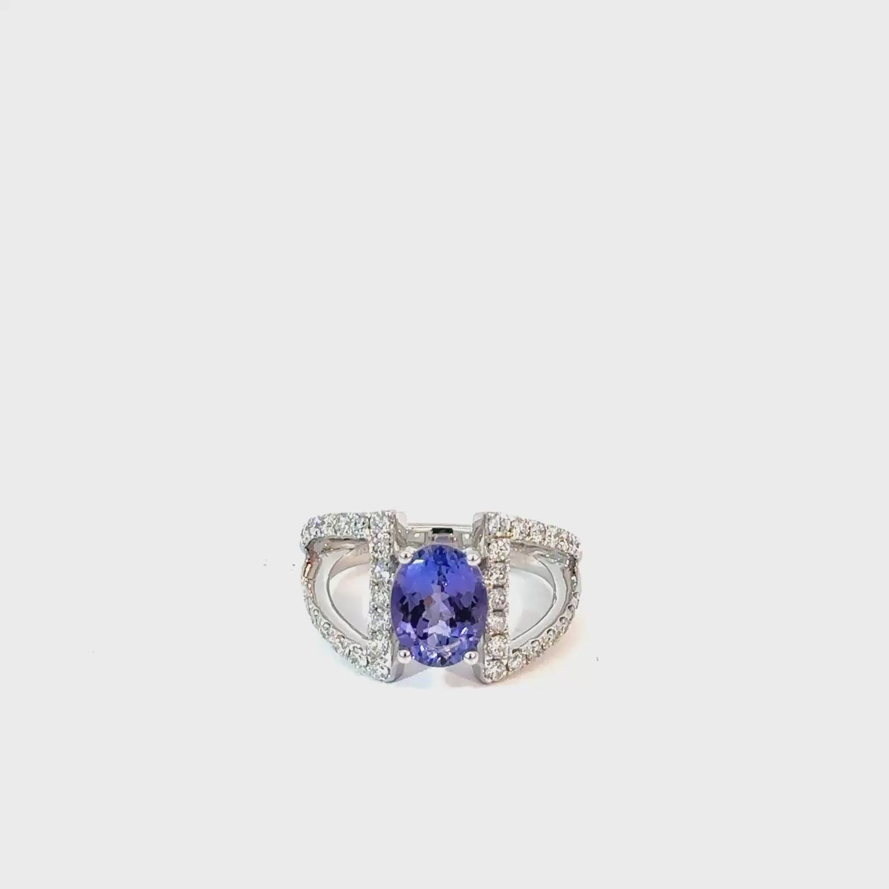 Platinum Ring (9.08grams) Showcasing A Four Prong Set Oval-Shaped Purple & Blue Tanzanite In A Modern Design. The 2.20ct Oval Cut Tanzanite Is Accented With A Cutout Style Band of 38 Round White Diamondsc(0.74tcw) Fashion Ring.