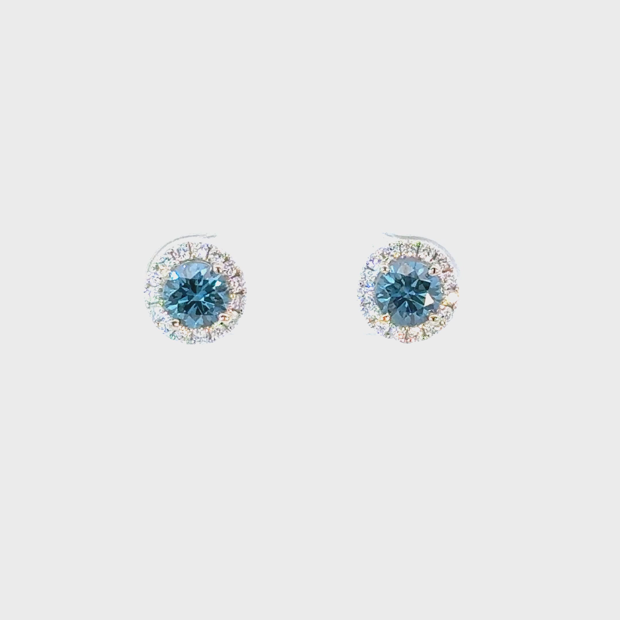 18K White Gold With Lab Grown Round Blue Diamonds (0.96tcw) Within Accent Round White Diamond Halo (0.27tcw) Stud Fashion Earrings