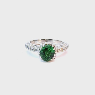 Platinum Custom Tacori Semimount with Natural Oval Green Tsavorite Garnet (1.54tcw) and 55 Round White Diamonds in the Halo and Band With Carved Details With Milgrain Fashion Ring.