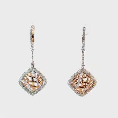 18k Two Tone Rose & White Gold Diamond Dangle Earrings, 360 Round Diamonds (2.2ct), 2.2TCW, 11 grams total weight. Elevate your style with these exquisite earrings, featuring brilliant-cut diamonds set in a delicate, openwork design, these earring exude sophistication. The rose gold setting complements the dazzling diamonds, creating a captivating sparkle.